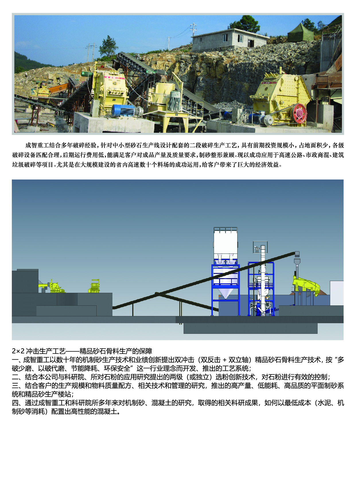 2×2沖擊生產(chǎn)工藝——精品砂石骨料生產(chǎn)的保障 一、成智重工以數(shù)十年的機(jī)制砂生產(chǎn)技術(shù)和業(yè)績(jī)創(chuàng)新提出雙沖擊(雙反擊+雙立軸)精品砂石骨料生產(chǎn)技術(shù),按 “多破少磨、以破代磨、節(jié)能降耗、環(huán)保安全”這一行業(yè)理念而開發(fā)、推出的工藝系統(tǒng); 二、結(jié)合本公司與科研院、所對(duì)石粉的應(yīng)用研究提出的兩級(jí)(或獨(dú)立)選粉創(chuàng)新技術(shù),對(duì)石粉進(jìn)行有效的控制; 三、結(jié)合客戶的生產(chǎn)規(guī)模和物料質(zhì)量配方、相關(guān)技術(shù)和管理的研究,推出的高產(chǎn)量、低能耗、高品質(zhì)的平面制砂系統(tǒng)和精品砂生產(chǎn)樓站; 四、通過(guò)成智重工和科研院所多年來(lái)對(duì)機(jī)制砂、混凝土的研究,取得的相關(guān)科研成果,如何以最低成本(水泥、機(jī)制砂等消耗)配置出高性能的混凝土。